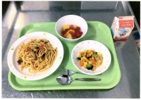 今日は、なすとトマトのスパゲッティ、マセドリアンサラダ、ゼリー入りフルーツポンチ...