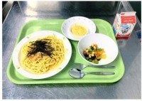 今日は、ツナおろしスパゲッティ、豆と野菜のマリネ、カップケーキ、牛乳です。ツナと...