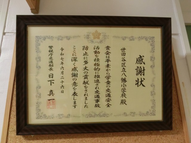 八幡小学校の交通安全への取り組みを認めていただき、警視庁より感謝状をいただきました。いつも地域の方々や主事さん方も見守ってくださり、子どもたちの交通安全が守られています。これからもみんなで交通ルールを守り、安全に登下校をしていきたいです。