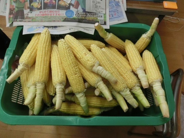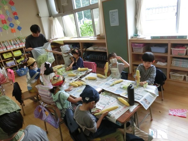 1年生がとうもろこしの皮むきに挑戦しました。給食に提供される「蒸しとうもろこし」になる「とうもろこし」です。栄養士さんから、とうもろこしの実っているところを見せていただきながら食材の説明を受けました。体験を通した食育を行っています。