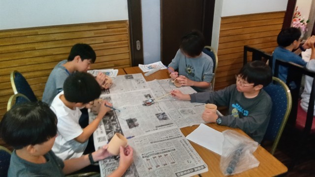 栃木県の伝統的な陶器である益子焼のマグカップへの絵付けを体験しました。おしゃべりは一切せずに、益子焼にしっかりと向き合うという時間です。どの子も世界に一つしかない自分の益子焼を作るために集中しました。絵付けした益子焼のマグカップは、このあと、焼いて仕上げていただきます。完成が楽しみですね。