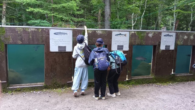 さかなと森の観察園を訪れました。池や水槽のさかなたちに餌をあげながら、さかなの観察です。たくさんのさかなたちが集まってくる様子を観るのはとても楽しいです。