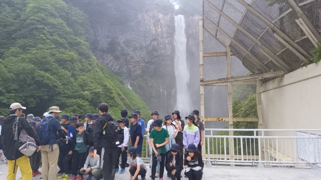 2日目最後の観光地は華厳の滝です。子どもたちは滝の迫力に驚きです。周囲の岩の美しさにも気付いて語り合っていました。