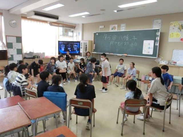 2学期最初の八幡っ子タイムです。5年生が1年生を教室まで迎えに行ったり、6年生はみんなで遊ぶ企画や準備をしたり、1年生から6年生までが一緒に楽しい時間を過ごします。2学期になって互いのことが分かり合ってきたのでさらに仲良くなり、遊びも盛り上がっていました。