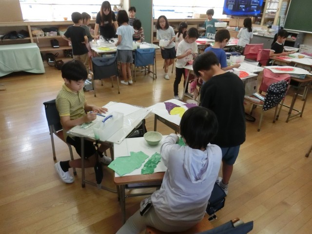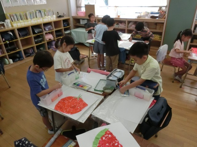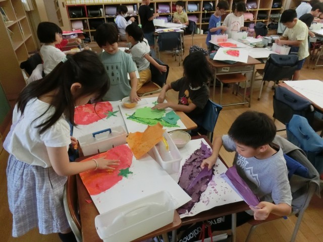 2年生が図工で大きな野菜や果物を描いています。「おいしそう!」とよーく見てみると、絵の具で色を付けた和紙をちぎって描いていました。どの子の野菜も果物も素敵です。完成が楽しみです!