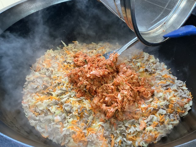 ※写真2枚目は豚肉、玉ねぎ、にんじんを炒めたところにキムチを入れたところです。