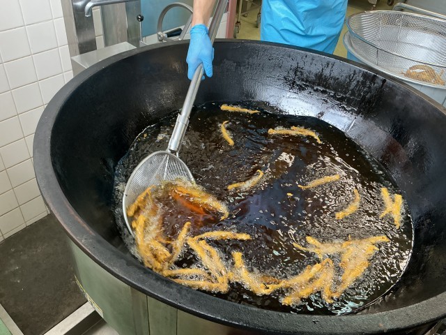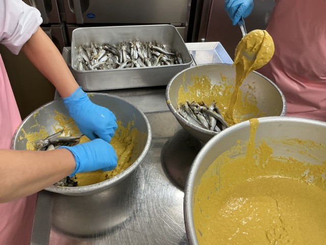 ※写真2枚目は小麦粉にカレー粉を合わせた衣をつけているところです。