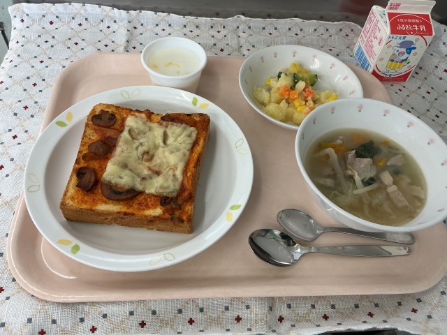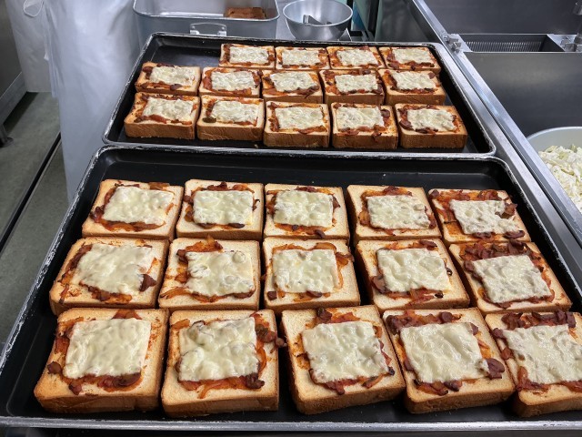 1年生の廊下で、「今日の給食はピザトースト!楽しみ」と声が聞こえてきました。