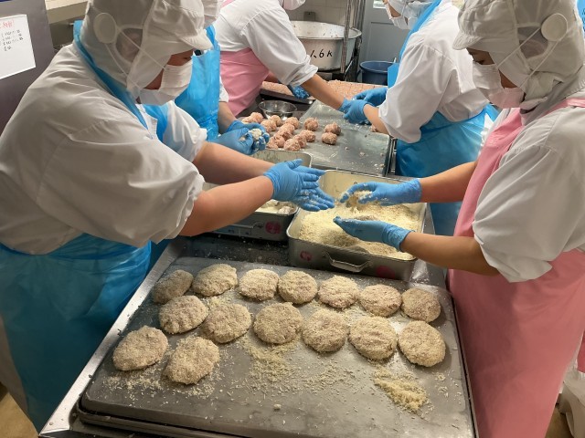 ※写真2枚目は1人分のメンチカツを分ける人、成型する人と分業しているところです。