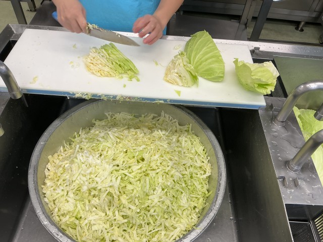 ※写真3枚目はメンチカツに添えるキャベツを切っているところです。給食では生野菜は出せないので少し、太めに切っています。