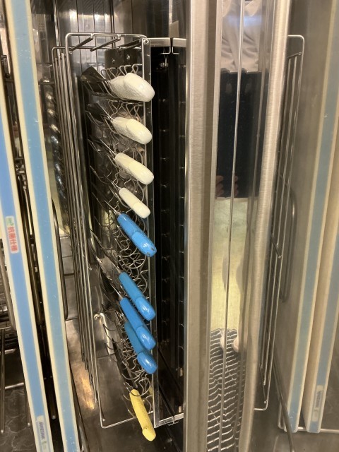 ※写真2枚目は給食を調理する時に使っている包丁です。作業ごとに使う色が決まっています。白は果物など生のまま食べる用、水色は調理する前(カレーやサラダに使う野菜)用、黄色は納品された野菜などの皮やヘタを切る用です。