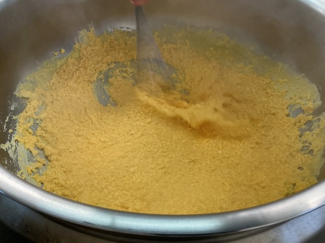 ※写真3枚目は炒り卵を作っています。大量の卵を焦げつかせないように素早く、作っています。