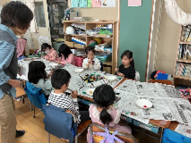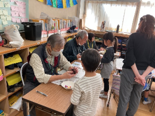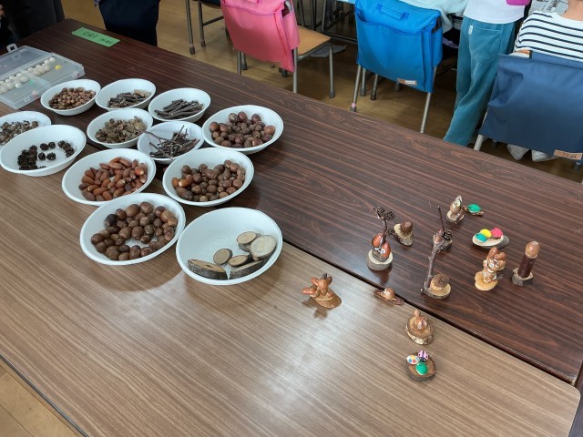 城南環境学習グループの皆様にお手伝いいただき、1年生がどんぐり工作に挑戦です。どんぐりや松ぼっくり、木の枝などを使って自分だけのテーブル飾りを作ります。子どもたちはみんな夢中です。たくさんの子がとても嬉しそうに作った作品を見せてくれました。城南環境学習グループの皆様、いつもありがとうございます。