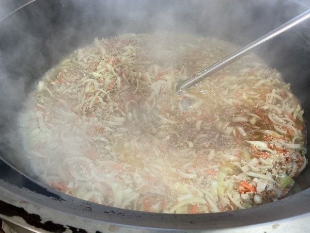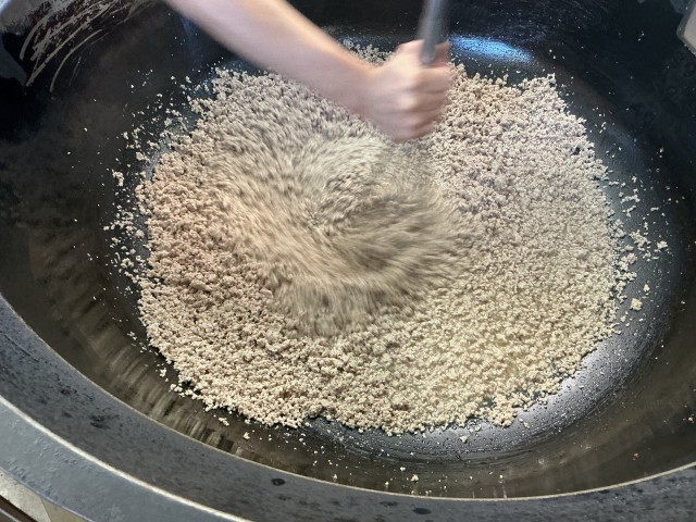 ※写真2枚目はそぼろを作っているところです。ある程度、火が通ったらダマにならないようにホイッパーを使って細かくしていきます。