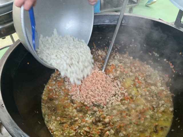 フライパンのままでは出せないので貝は割れてしまうと異物混入になってしまうので残念ながら今日の具はいか、えび、鶏肉、野菜でした。