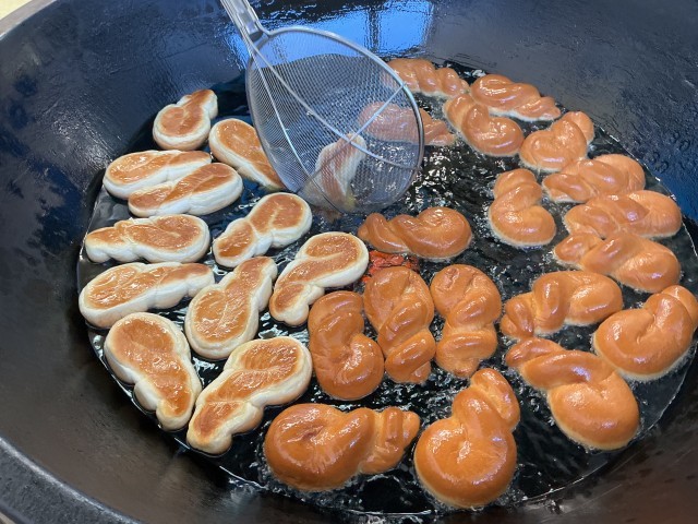 ※写真3枚目は揚げパンのパンを揚げています。給食では砂糖などがつきやすいようにねじりパンを使っています。表から揚げて裏へ返して揚げます。