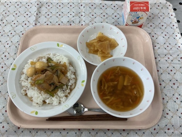 ルーローハンは台湾の郷土料理です。元々は肉屋で余った肉を使って作っていたそうです。半熟卵などを添えるようになったのは日本に入ってきてからのようです。給食ではうずら卵にしました。