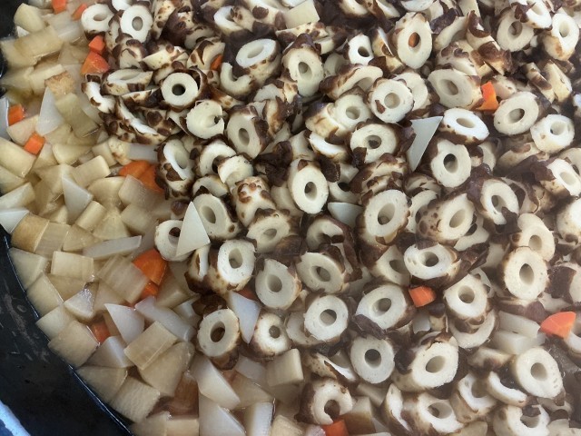 ※写真2枚目は下ゆでをしてから煮ているので早くも味が染みてきている大根や他の食材です。