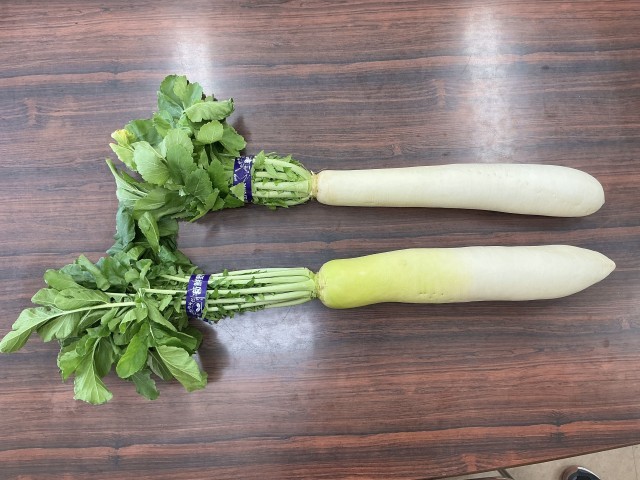 ※写真3枚目は上が大蔵大根、下が青首大根です。今年も各教室に持ってまわり見てもらいました。