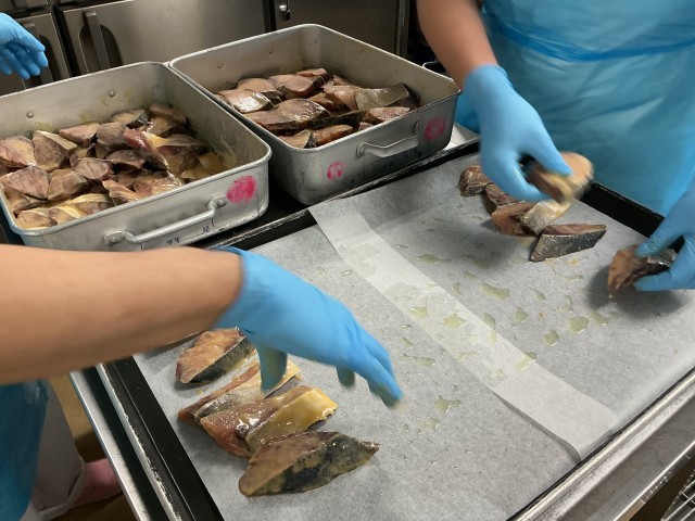 ※写真2枚目は西京みそに漬け込んでいたぶりを天板に並べています。みそには食材を柔らかくする働きがあります。