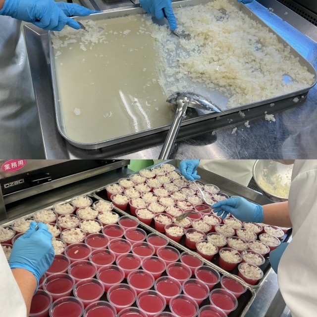 ※写真3枚目はキラキラゼリーの上の部分です。バットにレモンゼリーを作り、フォークで細かくしてクランベリーゼリーの上にのせました。