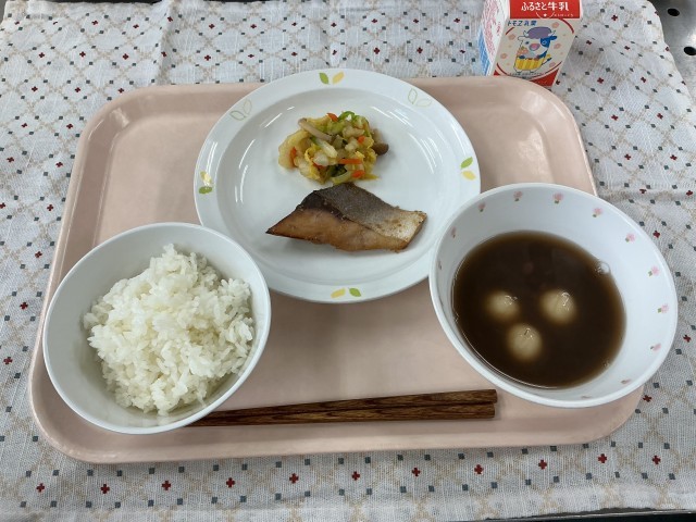 学校はお休みの日だったので給食では今日、お汁粉にしました。