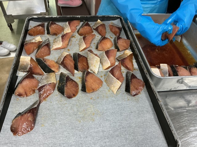 ※写真2枚目は下味をつけた出世魚のぶりを天板に並べているところです。