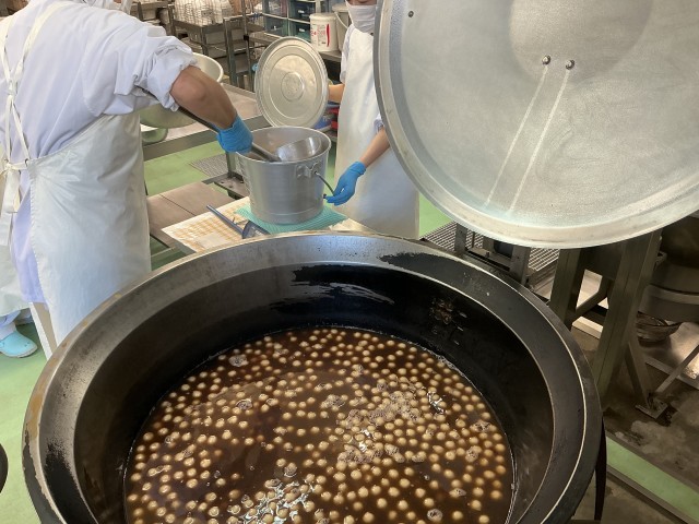 ※写真3枚目は白玉汁粉を各クラスの食缶に分けているところです。白玉もちが均等になるように目分量で分けていきます。