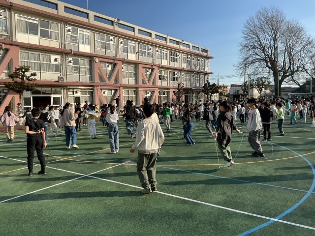 運動委員の子どもたちが、なわとび集会を企画してくれました。なわとびを使っていろいろな動きを楽しみました。お天気もよく、清々しい朝の運動タイムでした。