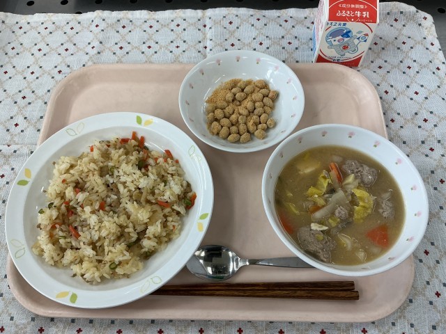 今日の給食ではいわしのすり身を使ったつみれ汁と豆まきにも使う炒り大豆を使ったきなこ豆にしました。