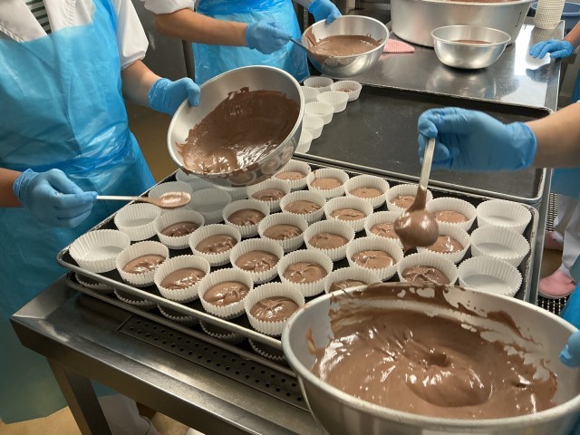 フォンダンショコラはフランスのチョコレートケーキです。フォンダンには「溶ける、溶ろけ流」という意味があるそうです。給食では絹豆腐と米粉、ココアを使ってもちもちしたフォンダンショコラにしました。