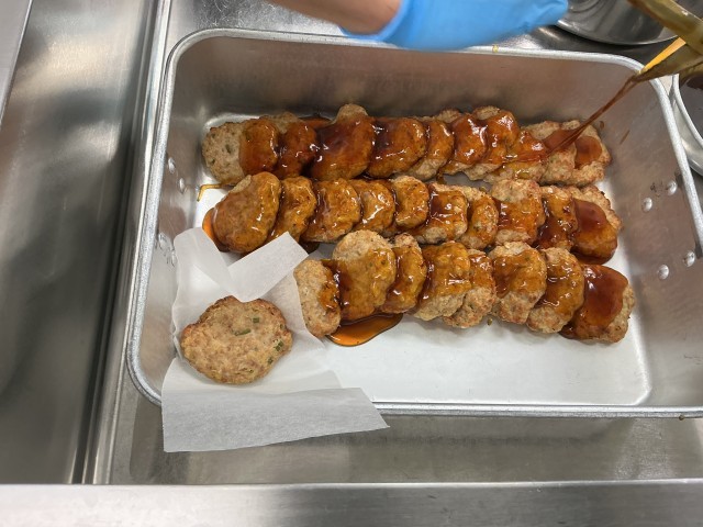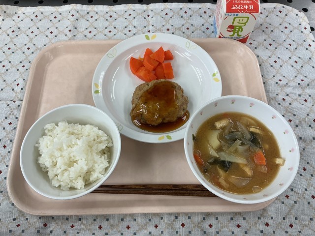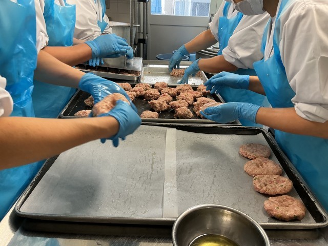 ※写真2枚目はハンバーグの成形をしているところです。左奥から薄いバット入れたタネを等分→一人分を取る→成形すると分業しています。(低、中、高学年でサイズを変えます。)