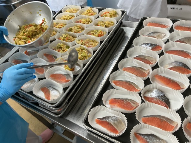 給食では野菜を先に炒めてから鮭の上にのせオーブンで焼きました。