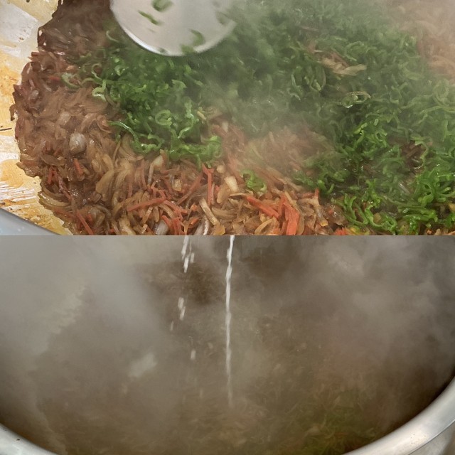 ※写真2枚目は白身魚の甘酢あんかけの甘酢餡を作っているところです。別ゆでしておいたピーマンを加えて水でといておいた澱粉(片栗粉)でとろみをつけて仕上げます。
