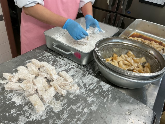 ※写真2枚目は下味をつけたイカにでんぷん(片栗粉)をつけているところです。