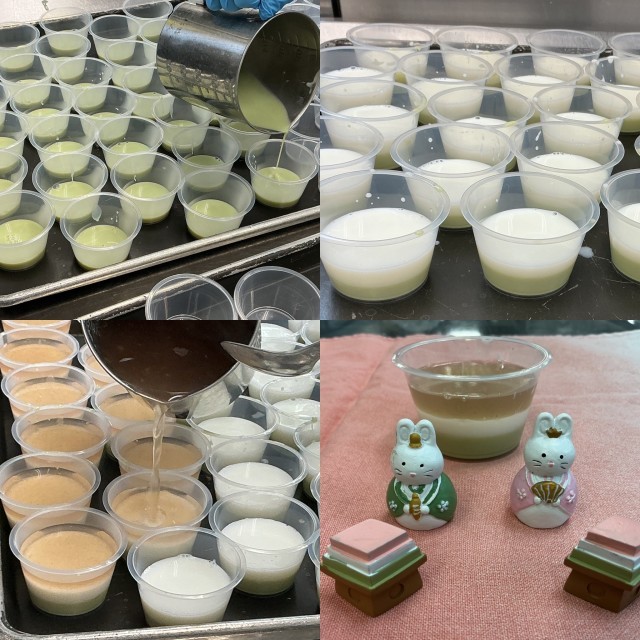 ※写真2枚目はひしもちならぬゼリーです。ピンクはいちごジャム、白は牛乳、緑は抹茶と牛乳です。抹茶ミルクゼリーが固まったのを確認してからミルクゼリー、また固まったのを確認してからいちごジャムゼリーと重ねました。