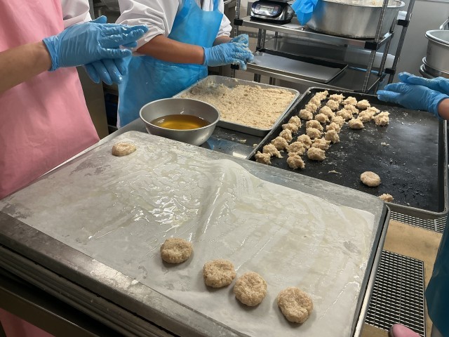 ※写真2枚目はナゲットの成形をしています。ハンバーグと同じように真ん中を少しへこませ火の通りをよくしています。