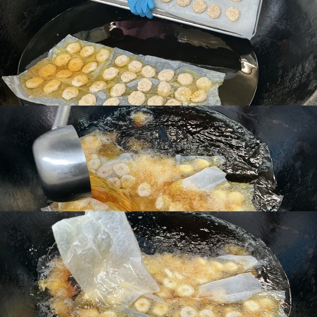 ※写真3枚目はナゲットを揚げ釜に入れているところです。ひき肉を使ったものはくっつきやすいのでクッキングシートごと釜にいれ表面に火が入ったらクッキングシートを取り出してます。