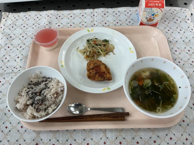 給食室から卒業のお祝いとして赤飯と紅白ゼリーにしました。