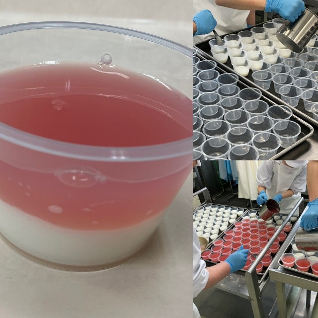 ※写真3枚目は紅白ゼリーを作っています。ミルクゼリーを入れ表面にできた泡を取り、固まったらクランベリーゼリーを注ぎ冷やし固めます。