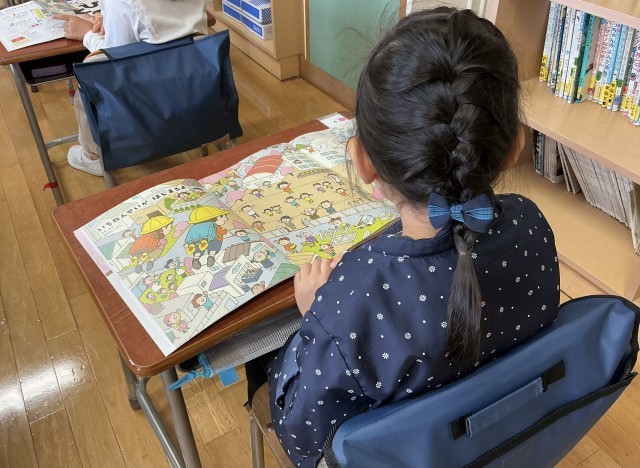 初めての学習は生活科です。「いちねんせいが はじまるよ」という単元で、学校内にある物や学校内のさまざまなきまりについて、実際にその場所に行ったり、教科書を見たりしながら、楽しく学びました。