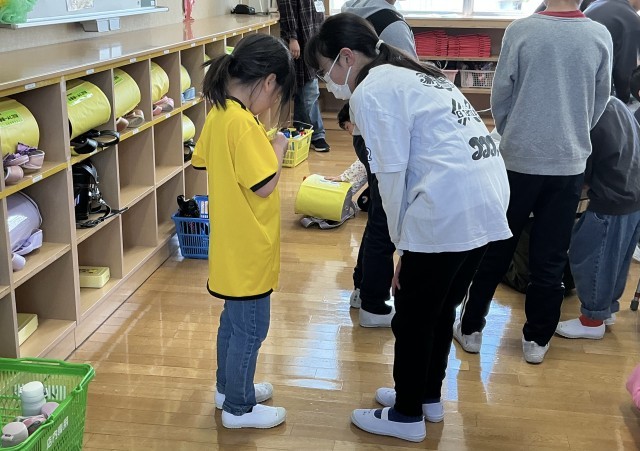 6年生は毎朝、まだ小学校の生活に慣れていない1年生の朝の仕度を手伝ってくれています。