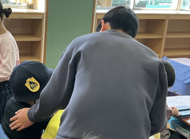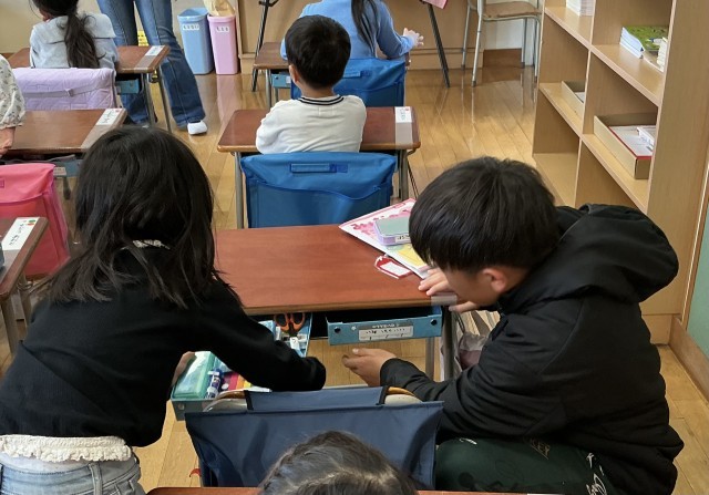 教材を仕舞う場所を伝えたり、1年生が自分で仕度できるようにアドバイスしたり、励ましたり…。