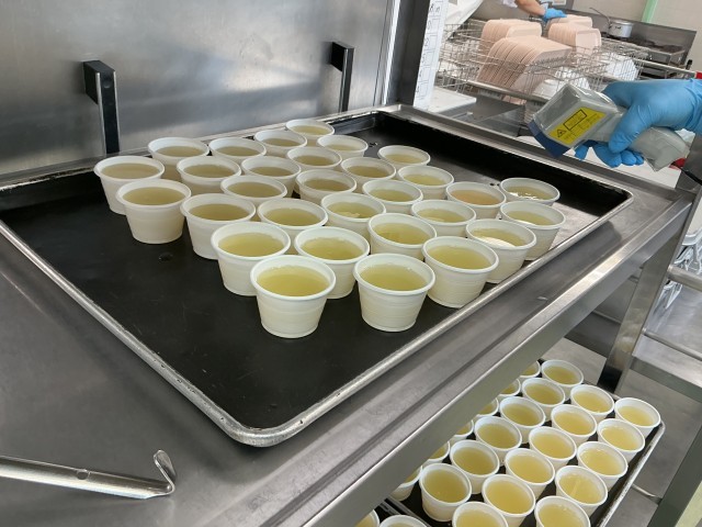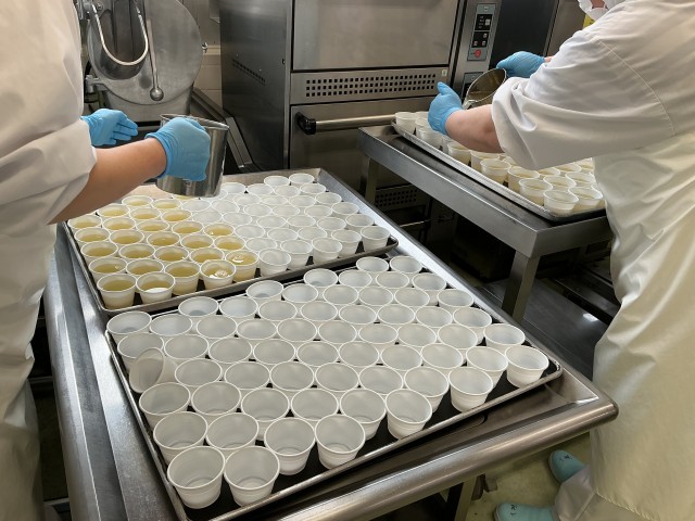 粗熱が取れたことを表面温度計で確認してクラスのバットに入れ冷蔵庫で固めます。
