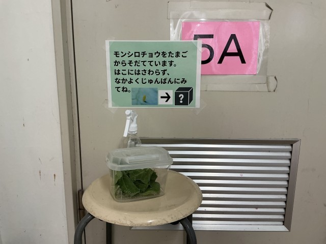 理科室の前にモンシロチョウの幼虫がいます。八幡ファームに植えられているキャベツに産みつけられた卵から生まれた幼虫です。成長の様子を観察しながら育てていきます。