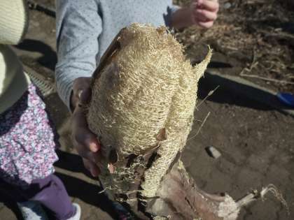 畑で育てていたヘチマ。その皮がパリパリになりたたくとはがれ落ちるようになりました。子どもたちが煉瓦の端でたたいて皮を落とすと、そこに白くきれいなヘチマのたわしになる部分が出てきました。