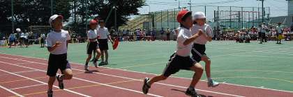 4年80メートル走。題して「もえろ!80メートル」。夏のような強い日差しの中、運動場の路面は熱せられてまさに熱い戦いに。それでも最後まで歯を食いしばって元気に走りきる4年生。