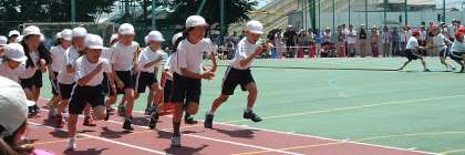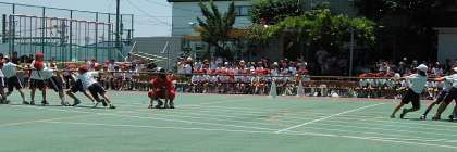 3年「走ってつなひき」。中央にのばされた綱には赤白10人あまりの先発隊が綱を引き合い、そこに応援隊が走っていって勝負を決する戦いです。スピードと力の勝負会場がわきました。