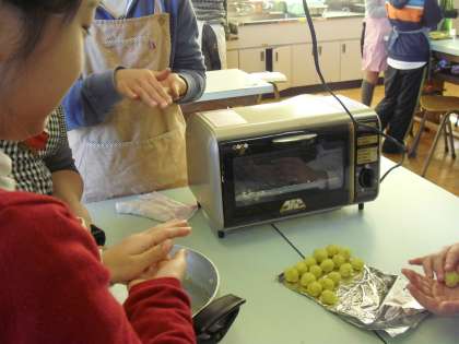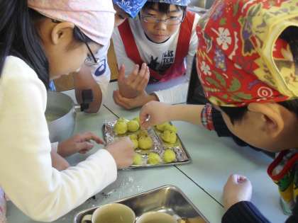 5年生が家庭科の授業でスイートポテトを作っていました。さつまいもをサイコロのように切り、ゆでてからマッシュでつぶし、砂糖・バター・塩・牛乳を入れて混ぜます。形を整えてごまを丁寧に飾りオーブンで焼きました。紅茶とスイートポテトをおいしく味わったことでしょう。