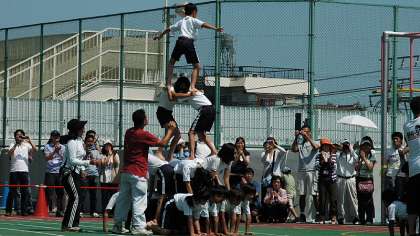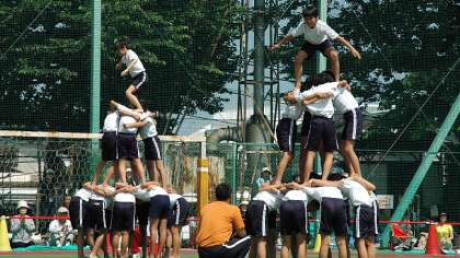 組体操のクライマックスは「3段タワー」。6年生が4つのタワーを完成。5年生も成功させました。